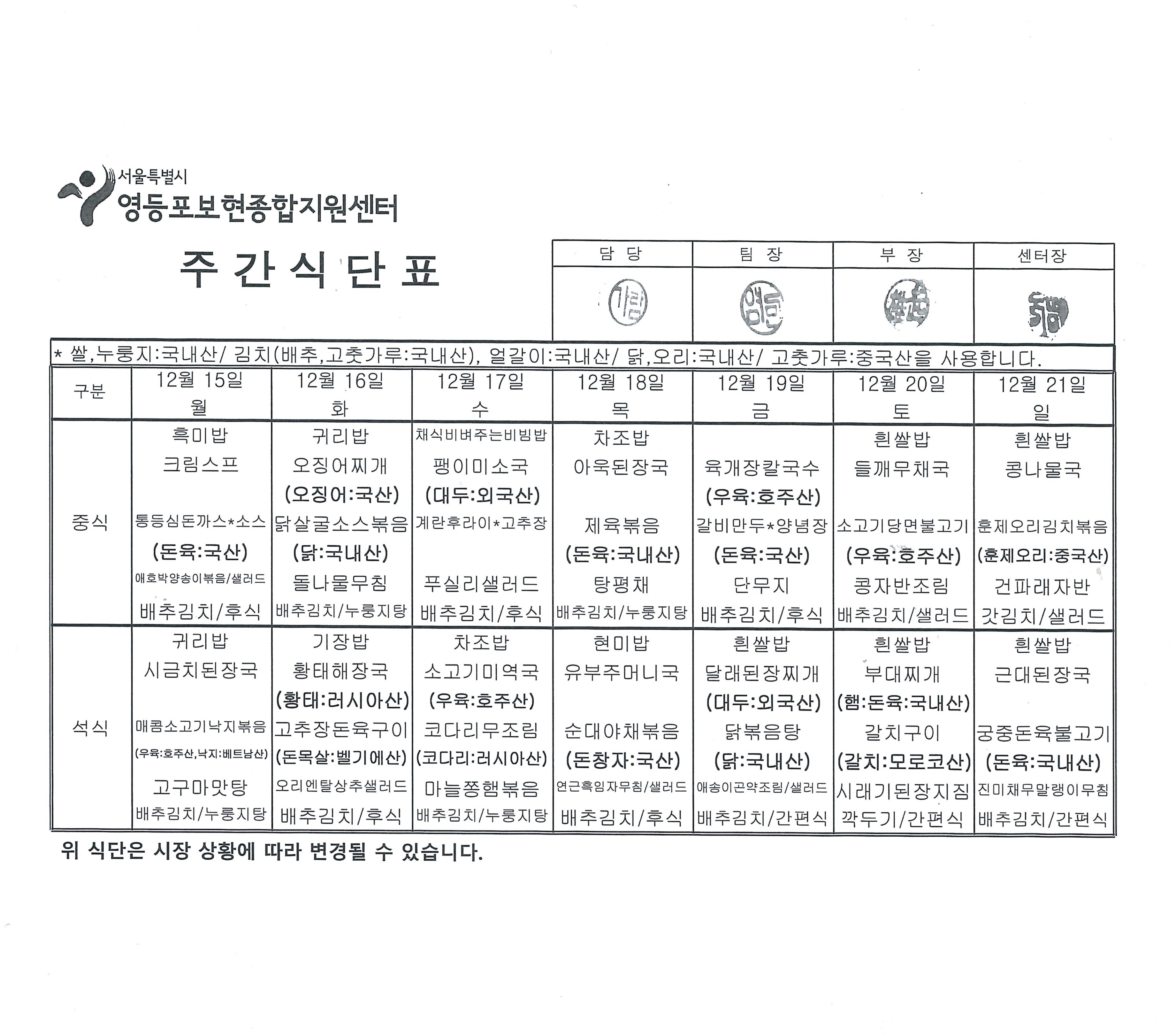 12월 3주차 식단표(15~21일)