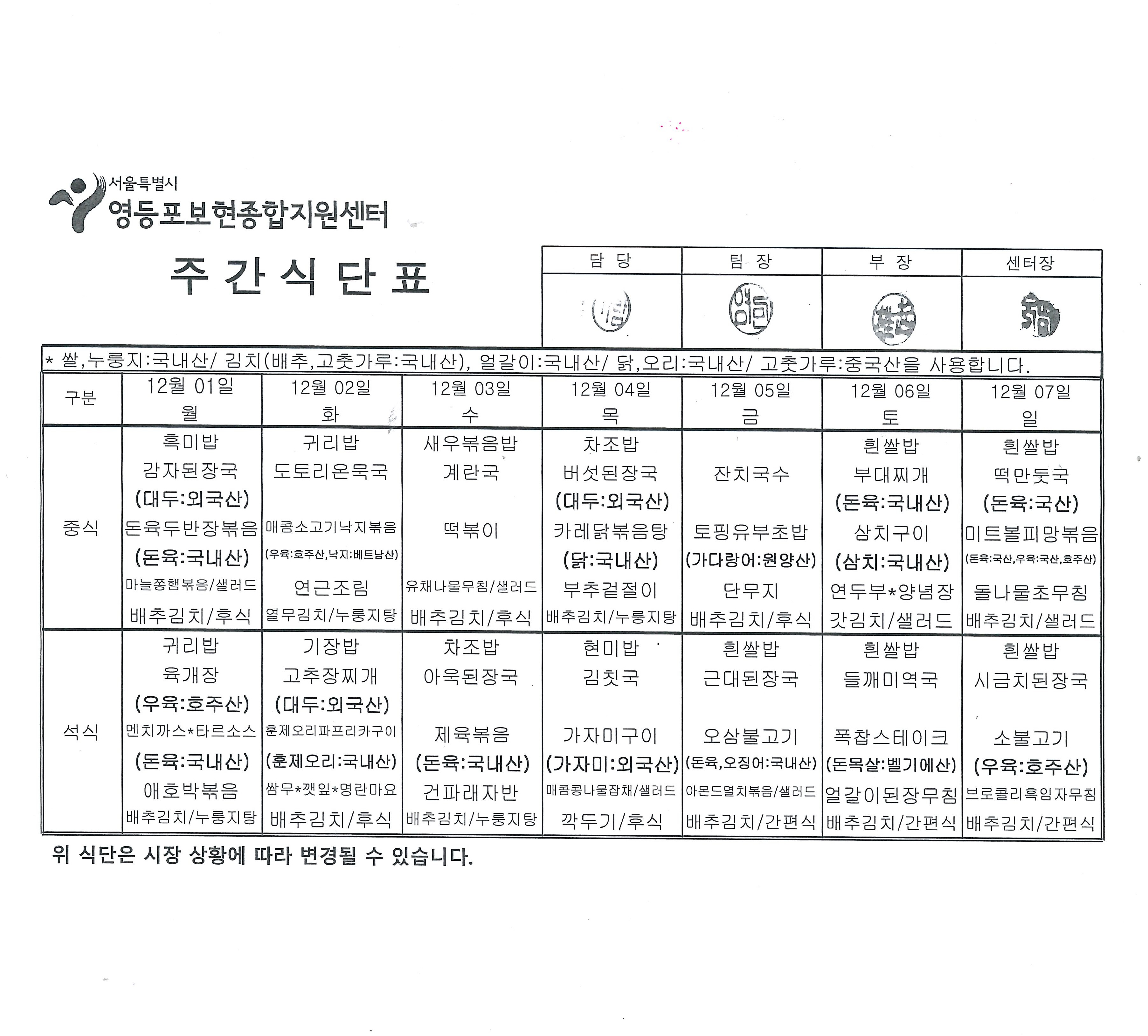 12월 1주차 식단표(1~7일) > 주간 식단표