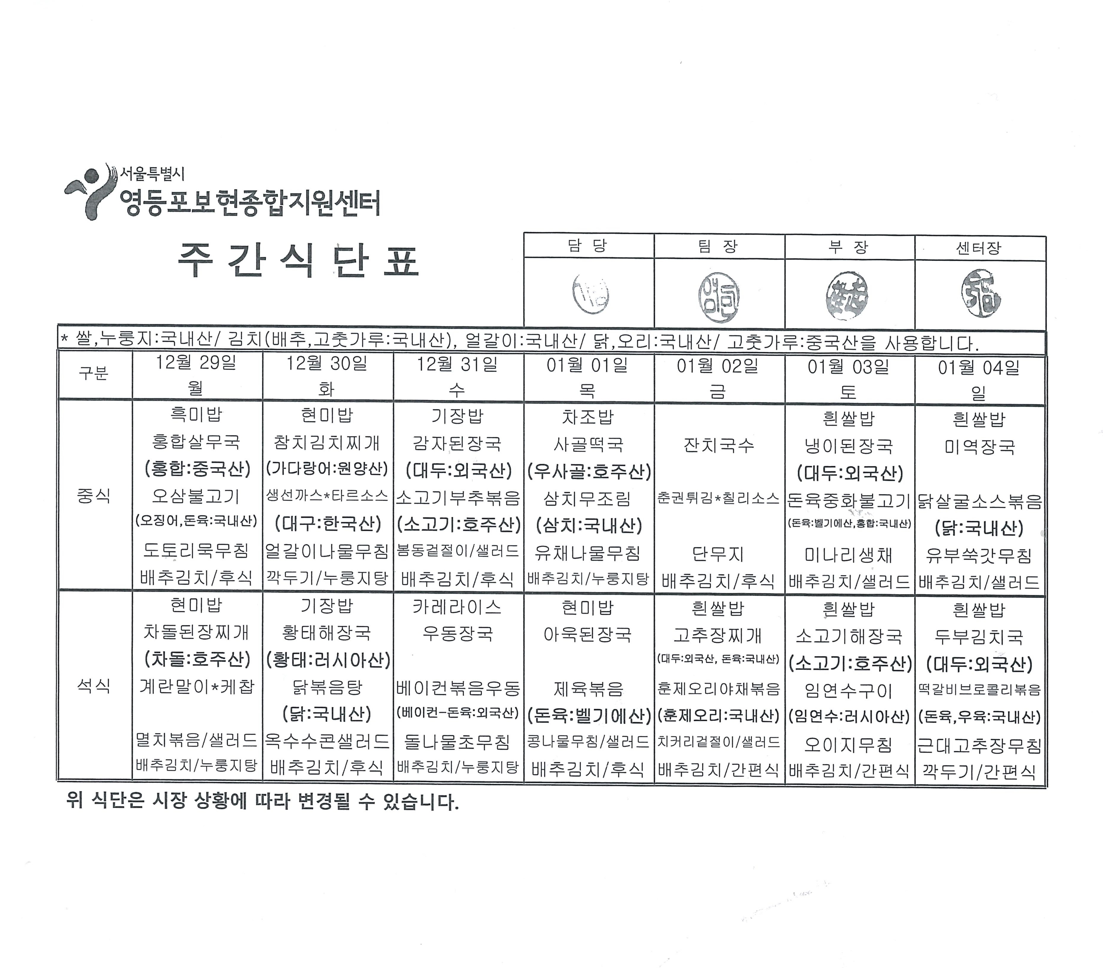 12월 마지막주 식단표 (30~1/4) > 주간 식단표
